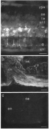 ganglion cell layer). Ganglion cell axons form the optic nerve (on) which exits the retina. 1, lens. (d) Fluorescent label is localized in the