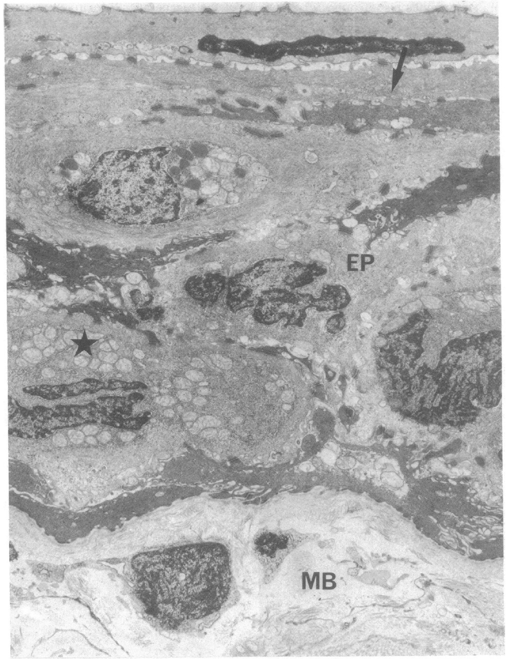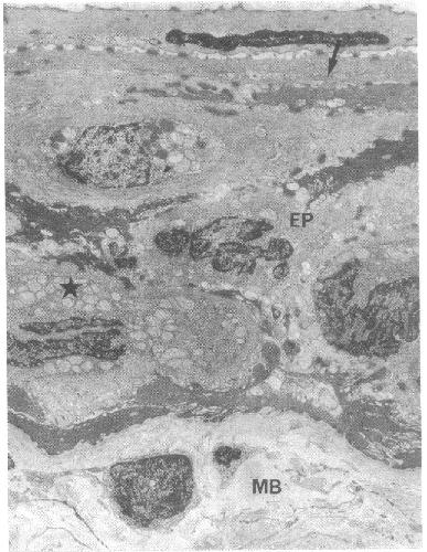 FIG. 4. Ultrastructure of the wound epithelium (EP). The cytoplasmic content is different in the outermost cells rich in cytokeratin