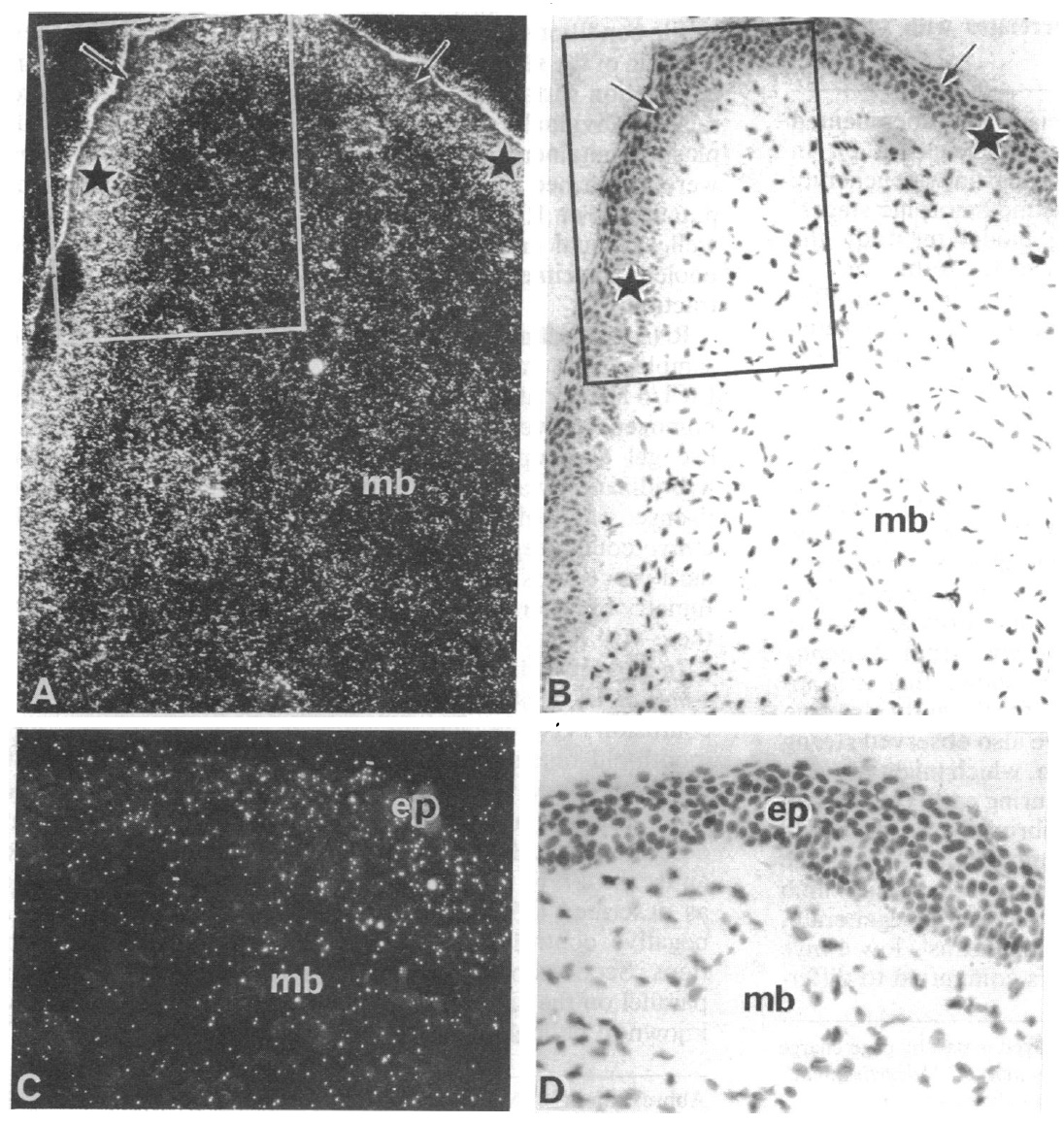 FIG. 2. Localization of c-myc RNA in the limb regenerate. In situ hybridizations were carried out as described in the text. (A and B) Sections were hybridized with a 35S-labeled mb. antisense c-myc RNA probe. (A) Regenerate under dark-field illumination. A high level of labeling was intermediate layers of the epithelium (star). The signal was much lower in the outermost layers (arrows). A moderate labeling was also detected in the mesenchymal cells (mb). (x 160.) (B) The same regenerate under bright-field illumination. The rim of autoradiographic grains lining the tissue sections is an artifact created during the procedure of autoradiography (drying of the emulsion). (x160.) (C and D) Control sections of the regenerate hybridized with a labeled sense c-myc RNA probe. (C) Dark-field illumination. Labeling is not above background in the epithelum (ep) and in the mesenchyme of the outgrowth (mb). (x200.) (D) Bright-field illumination. (x200.)