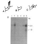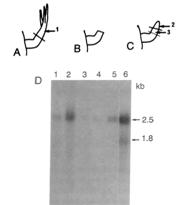 Figure 1. Northern blot analysis of c-myc expression in Xenopus limb regenerates and stumps.Limbs were amputated at the level of the radius-ulna ( A and B) and the distal regions (severed limbs) were kept as control limbs ( sample 1). Four weeks after amputation ( C) the regenerates , considered as the outgrowth about the amputation site, were harvested ( sample 2) as were stump tissues located above the elbow ( sample 3). D. Northern blot analysis of the total mRNA extracted from different tissues. Lane 1control limbs (8ug of RNA); lane 2, regenerates (12ug); lane 3, stumps (13ug); lane 4, 3x10000 Xenopus proliferative cells; lane 5 100000 Xenopus proliferative cells; lane 6, stage II oocytes (5ug). kb, Kilobases.