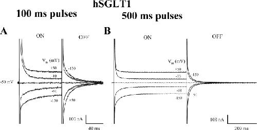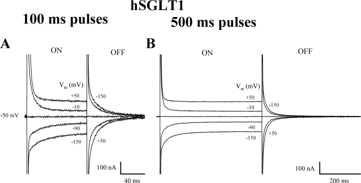 Figure 1. . Time course of the raw or total currents (capacitive and hSGLT1 presteady-state currents) of an oocyte expressing hSGLT1. The experiment was performed using a two-electrode voltage clamp, and all data were obtained from a single oocyte. Membrane potential was held at −50 mV (Vh) and then stepped to a series of test values Vt (from +50 to −150 mV in 20-mV decrements; representative traces are shown for +50, −10, −50, −90, and −150 mV) before returning to Vh. The pulse duration was 100 ms in A and 500 ms in B, and the currents, which are the average of three sweeps, have been filtered at 500 Hz (A) and 50 Hz (B). An upwards deflection of the current trace represents an outward current. |