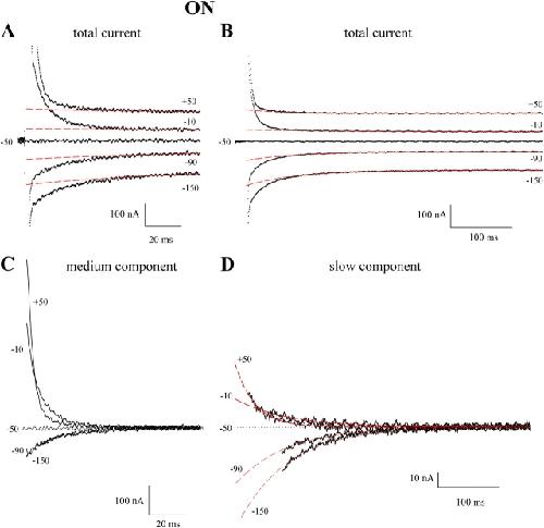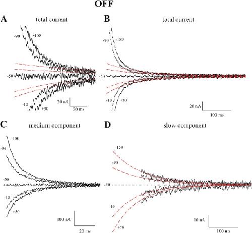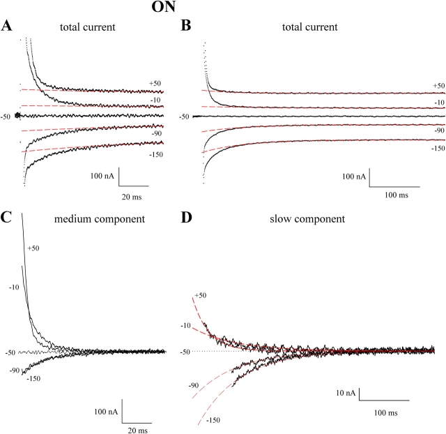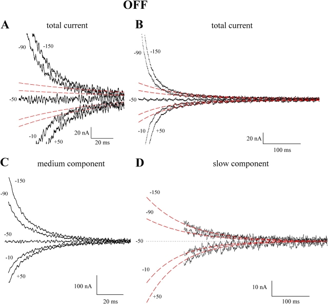 Figure 3. . Medium and slow components of the presteady-state currents of hSGLT1 (OFF response). Shown are the current records for the OFF pulse when membrane potential was stepped from the test potential (+50, −10, −50, −90, and −150 mV) back to the holding (−50 mV) for the 100 ms (A) and the 500 ms (B) duration pulses. The data were from the same oocyte as Fig. 1, and the protocol for isolation of the medium (C) and slow components of charge movement (D) is as described in Fig. 2. As τmed for OFF was independent of test voltage (τmed = 15 ms, see Fig. 4 A), the initial point for the fit (Fig. 3 B) was 96 ms for all the OFF pulses. |