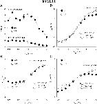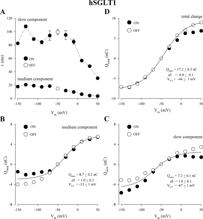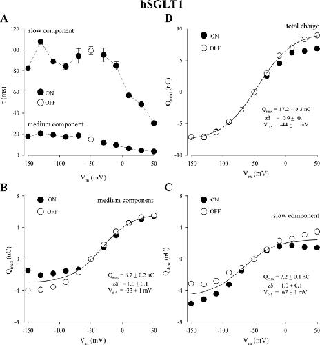 Figure 4. . Kinetics of charge movement of hSGLT1: voltage dependence of the medium and slow components. Data was from the experiment of Fig. 1. (A) ÏâV relations. The filled symbols represent the ON where membrane potential was stepped from Vh (â50 mV) to different test potentials (Vt). The open symbols represent the time constant of the relaxation of the OFF where membrane potential was returned from Vt to Vh (â50 mV). Error bars are standard errors (SE) of the fit when the SE exceeds the size of the symbol. The OFF responses were independent of the previous test potential (Vt), and open symbols represent the mean of 10 values with Vt varying between +50 and â150 mV. (B) QâV relations for the medium charge. At each Vm, the medium charge (Q) was obtained as the time integral of the medium presteady-state current for the ON (circles) and OFF (squares) responses. The curve is the fit of the mean of the medium ON and OFF charge to the Boltzmann relation with Qmax = 8.7 ± 0.2 nC, zδ = 1.0 ± 0.1, and V0.5 = â33 ± 1 nC. (C) QâV rela tions for slow charge. Slow charge (Q) was obtained from the time integral of the slow presteady-state current for the ON and OFF responses. The curve is the fit of the mean of the slow ON and OFF charge to the Boltzmann relation with Qmax = 7.2 ± 0.1 nC, zδ = 1.0 ± 0.1, and V0.5 = â67 ± 1 nC. (D) QâV relations for total charge. Total charge is the sum of the medium and slow components (described in B and C). Filled and open symbols represent the total ON and OFF, respectively. The smooth curve is the fit of the total OFF charge to the Boltzmann relation with Qmax = 17.2 ± 0.3 nC, zδ = 0.9 ± 0.1, and V0.5 = â44 ± 1 mV. |