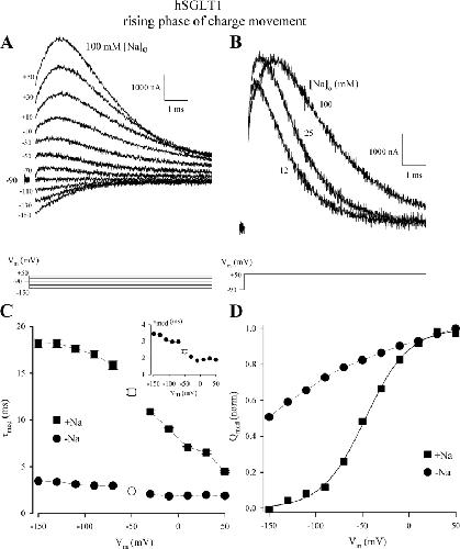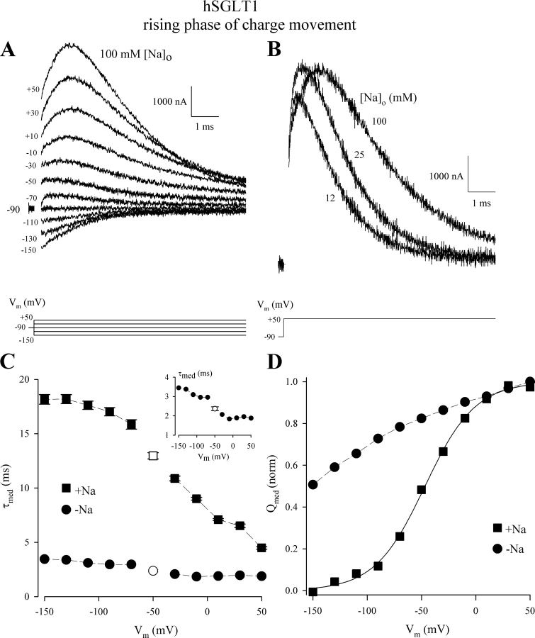 Figure 5. . Rising phase of charge movement. The experiment was performed on hSGLT1 using a two-electrode voltage clamp. Current records were obtained by phlorizin subtraction. Vh was −90 mV, data were digitized at 8 μs per sample, and pulse was 6 ms. (A) Presteady-state currents in 100 mM [Na+]o. (B) Dependence of the rising phase on [Na+]o. The current records were obtained at Vt = +50 mV in 100, 25, and 12 mM [Na+]o. (C) τ–V relations for the medium component in 100 and 0 mM [Na+]o. Data were obtained from one oocyte. The open symbols were obtained from the OFF response and represent the mean of 10 values (with test potential varying between +50 and −150 mV). (D) Q–V relations for the medium component in 100 and 0 mM [Na+]o. Q was obtained from the mean of the ON and OFF charges using 100-ms pulses in 100 mM Na+ and 30-ms pulses for 0 mM Na+. The curve (for 100 mM Na+) was drawn using the Boltzmann relation with Qmax = −20.3 ± 0.4 nC, zδ = 1.1 ± 0.1, and V0.5 = −47 ± 1 mV. |