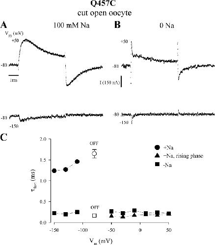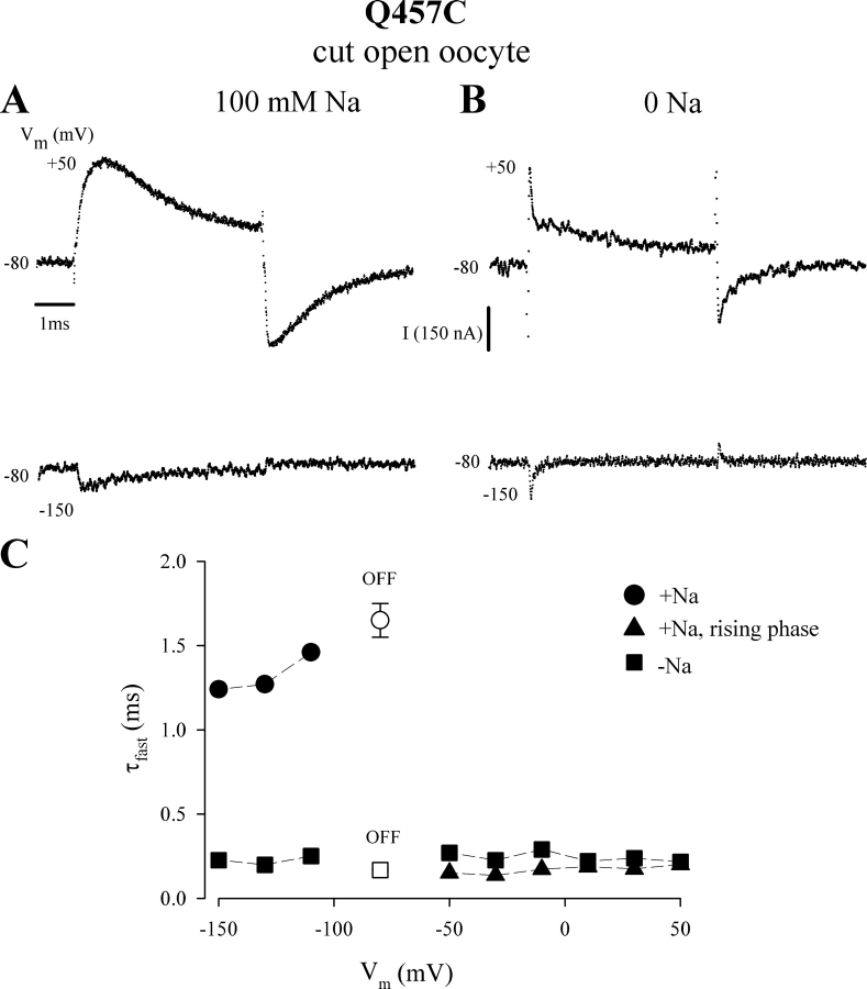 Figure 6. . The rising phase of charge movement in hSGLT1-Q457C. The experiment was performed on TMR6M-labeled Q457C using the cut-open oocyte voltage clamp. The currents have been compensated for membrane capacitance and background current using the P/4 protocol with a Vshp of −150 mV. External and guard solutions contained 100 mM Na-methanesulfonate and internal solution contained 100 K-methanesulfonate. Data was digitized at 5 μs per sample. Vh was −80 mV. The Vt values were +50 and −150 mV. (A) Presteady-state currents in 100 mM [Na+]o. Current trace at +50 mV was averaged from 10 sweeps. The other records were single sweeps. (B) Presteady-state currents 0 [Na+]o. The records were single sweeps. Current and time scales are the same for A and B. (C) τ–V relations for fast charge. Data is from the experiment of A and B (Vh = −80 mV). The filled symbols are from the ON, and open symbols from the OFF response. The circles (•) are obtained from the decay of the presteady-state current with hyperpolarizing pulses in 100 mM [Na+]o. The triangles (▴) were from the rising phase of the presteady-state current with depolarizing pulses and were obtained using a two exponential fit with the constraint that the time constant of decay was the same as those obtained from the same oocyte with 100-ms pulses. The squares (▪) are the time constants of current decay in the absence of Na+. |