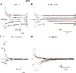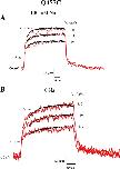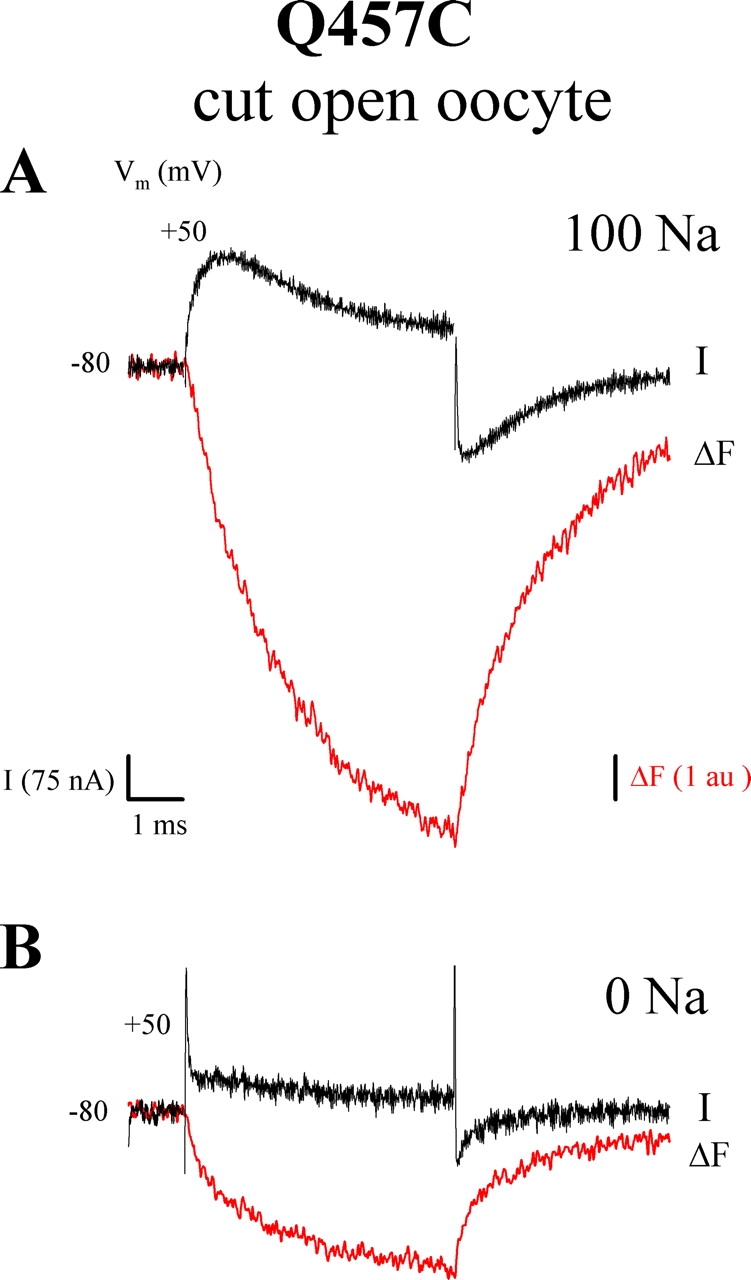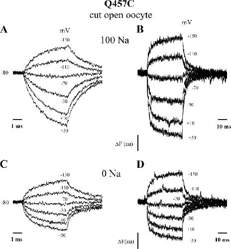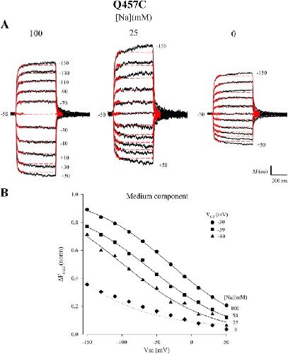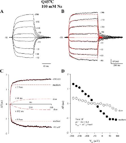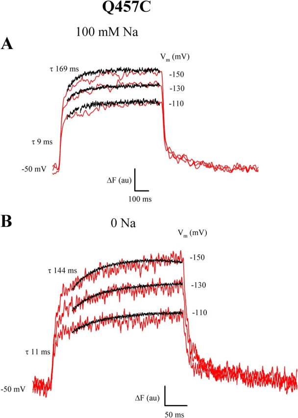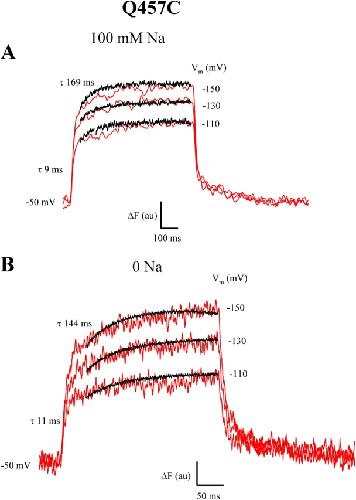Figure 12. . Correlation between slow charge and fluorescence. Experiment was performed using a two-electrode voltage clamp on TMR6M Q457C. (A) Correlation between slow charge and fluorescence (red traces) in 100 mM [Na+]o. The charge record has been normalized to agree with ΔF at 40 and 750 ms. Shown are records at hyperpolarizing voltages of −110, −130, and −150 mV from Vh = −50 mV. ΔF contained two voltage-independent time constants of 9 ± 1 ms (n = 10) and 169 ± 19 ms (n = 7) for the ON, and 9 ± 1 ms (n = 10) and 154 ± 9 ms (n = 9) for the OFF response. τslow for charge (ON) was 104 ± 10 ms (n = 3). (B) Correlation between slow charge and slow fluorescence in Na+-free solution. Pulse duration was 300 ms, and Vh was −50 mV. The current records have been normalized to agree with the fluorescence at 50 and 300 ms (as in A). ΔF (for the ON pulse) contained two voltage-independent time constants of 11 ± 1 ms (n = 8) and 144 ± 15 ms (n = 8). τslow for charge (ON) was 63 ± 8 ms (n = 3). |