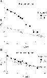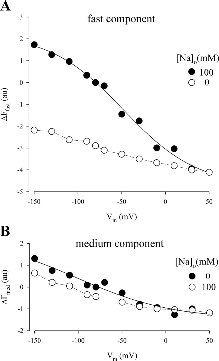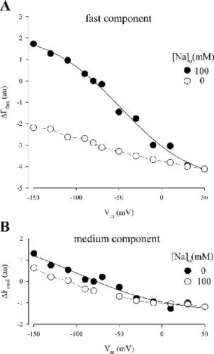 Figure 11. . Na+ dependence of the fast and medium components of ΔF. The fast and medium fluorescence amplitudes were obtained by fitting the time course of ΔF to two exponential components (compare, Fig. 7). (A) ΔF–V relation for the fast component. The curve is the fit of the data in 100 mM Na+ to the Boltzmann relation with ΔFmax = 7.0 au, z = 0.6, and V0.5 = −48 mV. The ΔF–V curve in 0 Na+ has been shifted to align with that of 100 mM Na+ at +50 mV. (B) ΔF–V relation for the medium component. The curve is the fit of the data in 100 mM Na+ with ΔFmax = 3.8 ± 1.9 au, z = 0.5 ± 0.3, and V0.5 = −100 ± 47 mV. The ΔF–V curve in 0 Na+ has been shifted to align with that of the 100 mM Na+ at +50 mV. |