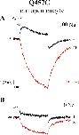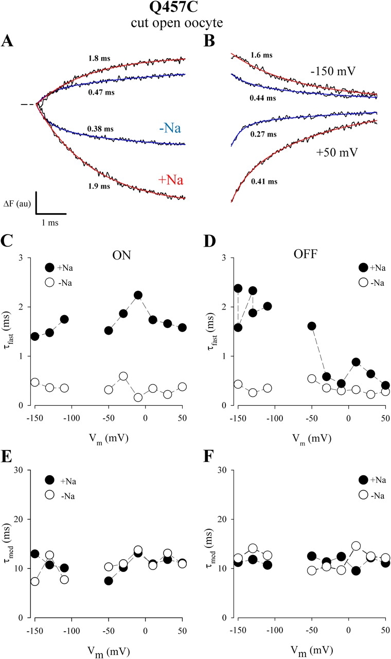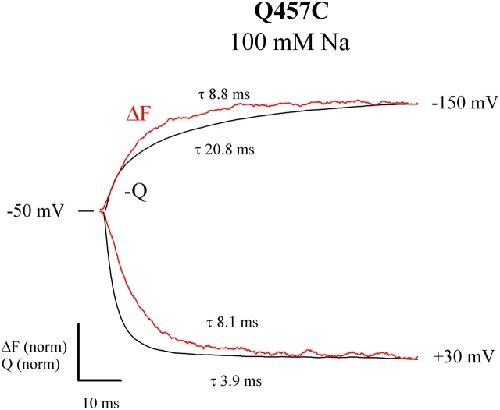 Figure 13. . Correlation between medium charge and fluorescence. Experiment was performed using a two-electrode voltage clamp on a TMR6M-labeled Q457C in 100 mM NaCl buffer. Vh was −50 mV. The time course of Q and ΔF are compared at +30 and −150 mV. Q was obtained from the total current by subtraction of the steady-state current and the oocyte membrane capacitive transient. The traces have been normalized to agree at the end of the voltage pulse (75 ms). The numbers next to the traces are the time constants of Q and ΔF. |
