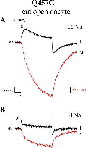 Figure 14. . Correlation between fast charge and fluorescence. The experiment was performed using the cut-open oocyte on TMR6M-labeled Q457C (from the oocyte of Fig. 6). Membrane potential was held at −80 mV and stepped to +50 mV. (A) Comparison of the rising phase of the presteady-state current (I) and fluorescence (ΔF) in 100 mM [Na+]o. I is from Fig. 6 A and ΔF is from Fig. 9 A. (B) Comparison of charge and ΔF in absence of Na+. I is from Fig. 6 B and ΔF is from Fig. 9 C. |