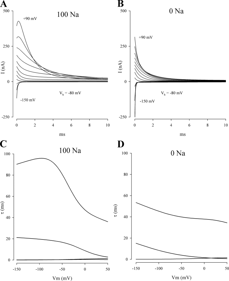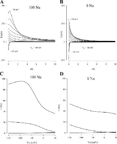 Figure 16. . A model simulation for the presteady-state currents (A and B) and τ–V relations (C and D) in 100 and 0 mM external [Na+]. Simulations were performed on the kinetic scheme: C2↔C1↔C1a↔C1b↔C6 using the assumptions and rate constants summarized in Fig. 15 C. The simulation was performed with the membrane potential held at −80 mV at 20°C, and the voltage pulses (between +90 and −150 mV in 20 decrements) were applied for 10 to 500 ms. The differential equation relating the time evolution of states was solved numerically at each test voltage using Berkeley Madonna. The equation is The sum of the occupancy probabilities in all the states is 1 (C1+C2+C1a+C1b+C6=1). For simulation, the total number of transporters in the oocyte plasma membrane was 5 x 109 transporters (Zampighi et al., 1995). There are four components of charge movement (C2↔Cj) the charge (Iij) was calculated by Iij = , where e is the elementary charge, ɛij is the voltage dependence, and kij is the rate constants for transition from Ci to Cj (see also Krofchick and Silverman, 2003). The eigenvalues (which are reciprocals of the time constants) of the matrix were obtained using MATLAB 6.0 (The MathWorks Inc.). |