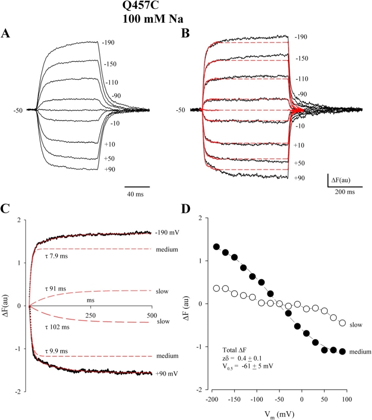 Figure 7. . Slow (ΔFslow) and medium (ΔFmed) components of ΔF. The experiment was performed using a two-electrode voltage clamp on a TMR6M-labeled Q457C. Bath solution contained 100 mM Na+. (A) Time course of ΔF for a 100-ms pulse. Vh was −50 mV and the Vt values are indicated next to the traces. (B) The corresponding ΔF records for a 500-ms pulse, and superimposition of the short and long (100- and 500-ms) pulses. The traces from the 100-ms pulses (from A) have been split to overlap with the 500-ms pulses at the onset of the ON and OFF. The dotted lines indicate the ΔF at 100 ms. (C) ΔFmed and ΔFslow. The time course of total ΔF (shown for Vt of +90 and −190 mV) was fitted (smooth curves) to two exponential components: ΔF = ΔFmed (1 − exp(−t/τmed)) + ΔFslow (1 − exp(−t/τslow)), where ΔFmed, ΔFslow, τmed, and τslow are the amplitudes and time constants of the medium and slow components. Parameters obtained from the fit were as follows: at +90 mV, ΔFmed = −1.17 au, τmed = 9.9 ms, ΔFslow = −0.38 au, τslow = 102 ms; at −190 mV, ΔFmed = −1.33 au, τmed = 7.9 ms, ΔFslow = −0.36 au, τslow = 91 ms. Dashed curves represent the ΔFmed and ΔFslow components (from the fit) with the time constants next to the traces. The τ's were independent of Vt (between +50 and −150 mV). τmed was 7.9 ms and 8.5 ms (n = 10) for the ON and OFF responses, respectively. τslow ranged between 60 and 150 ms with a mean of 92 ms for the ON, and 138 ms for the OFF. (D) ΔFmed–V (filled circles) and ΔFslow (open circles) relations. ΔF (at each Vt) was obtained from fitting the relaxation of ΔF to two exponential components (as in C). The ΔFmed–V and total ΔF–V relations (sum of ΔFmed and ΔFslow) were fitted with the Boltzmann relation with ΔFmax = 3.00 ± 0.15 au, zδ = 0.4 ± 0.1, V0.5 = −61 ± 4 mV; and ΔFmax = 3.86 ± 0.24 au, zδ = 0.4 ± 0.1, V0.5 = −61 ± 5 mV. |