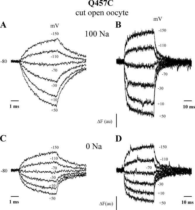 Figure 9. . Fast fluorescence changes. Data was obtained using the cut-open oocyte on a TMR6M-labeled Q457C. External and guard solutions contained 100 mM Na-methanesulfonate and internal solution contained 100 mM K-methanesulfonate. Subtracting holding potential (Vshp) was −150 mV. The records were the averages of 20 sweeps. Data was digitized at 5 μs per sample (A) and 50 μs per sample (B). C and D show the time course of ΔF in Na+-free solution (choline replacement). Digitizing rate was 5 μs per sample (C) and 50 μs per sample (D). |