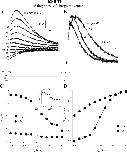 Figure 15. . Kinetic model for Na+/glucose cotransport (modified from Parent et al., 1992). (A) The transporter has six kinetic states consisting of the empty transporter C (states C1 and C6), the Na+-bound CNa2 (states C2 and C5) and the Na+- and sugar-bound SCNa2 (states C3 and C4) in the external and internal membrane surfaces. Two Na+ ions bind to the transporter before the sugar molecule. The shaded region represents the voltage-dependent steps: conformational change of the empty transporter between the external and internal membrane surfaces (C1↔C6); and Na+ binding/dissociation (C1↔C2). The simplifying assumption (for high external [Na+]) is that the two Na+ binding steps are lumped into one. The distribution of the conformations depends on membrane voltage. The transporter is in C2 at large hyperpolarizing voltages, and C6 at large depolarizing voltages. In the TMR6M-labeled Q457C, sugar transport is abolished, and since Na+ binding/dissociation at the cytoplasmic surface may be neglected because internal [Na+] is low and internal Na+ binding constant is high (see materials and methods), only the partial reactions in the shaded area are studied. (B) Seven-state model for presteady-state current. C1a and C1b represent intermediate states between C1 and C6, and C2a and C2b are the states with one Na+ bound. The rate constants (kij) for transition between two states (Ci→Cj) are defined by kij = kijo exp(−ɛijFV/RT), where kijo is a voltage-independent rate, ɛij is the voltage dependency, and F, R, and T have their usual physicochemical meanings. (C) A simplified five-state kinetic model for charge movement and the assumptions on the rate constants that were used for the simulation described in Fig. 16. |