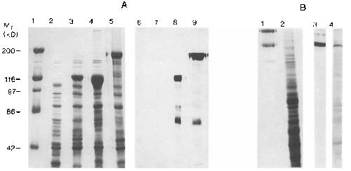 the trpE-LN fusion gene (lanes 4 , S), the unfused lacZ gene (lanes 3, 3, or the IacZ-LN fusion gene (lanes 5 , 9). Molecular-weight