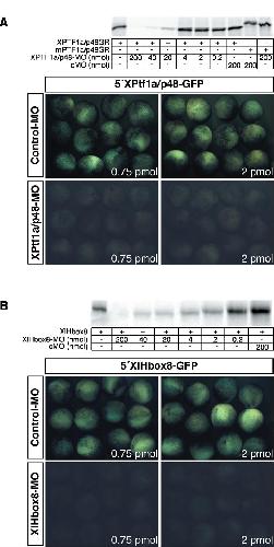 (A) XPtf1a/p48 MO specifically inhibits the translation of its target mRNA, as revealed by an in vitro transcription and translation assay (upper panel), as well as by mRNA and MO co-injection into whole embryos (lower panel). GFP expression in live embryos at stage 11 of embryonic development was analyzed by use of an Olympus (SZX12) fluorescence microscope. mPTF1a/p48GR is the murine construct used in the rescue experiment (see also Fig. S6) which is not a specific target for the XPtf1a/p48 MO.