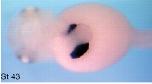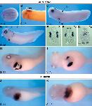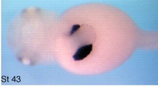 ptf1a (pancreas associated transcription factor 1a) gene expression in Xenopus laevis embryo, assayed via in situ hybridization, NF stage 43, ventral view, anterior left.