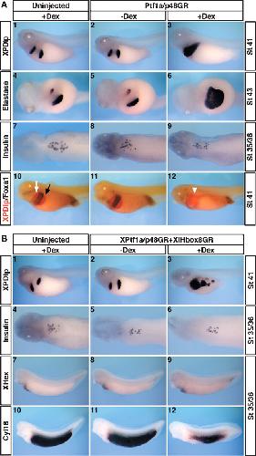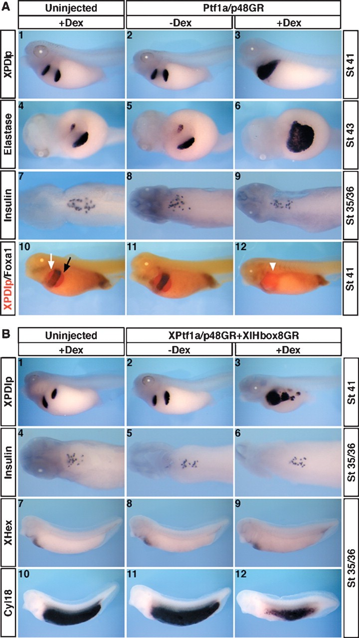 Figure 2. A combination of XPtf1a/p48 and XlHbox8 induces ectopic pancreatic differentiation. (A) Whole-mount in situ hybridization analysis of a panel of markers reveals that ectopic expression of XPtf1a/p48 converts part of the presumptive stomach and duodenum into a pancreatic fate. (Panels 1â3) Lateral view. Ninety-three percent of the embryos examined showed effects as in panel 3 (n = 62). (Panels 4â6) Ventral view. Phenotype in panel 6, 87%, n = 24. (Panels 7â9) Dorsal view (head toward the left) after removal of somites, neural tube, and notochord. As shown in panel 9, none of the embryos examined exhibited altered insulin expression (n = 25). (Panels 10â12) Lateral view. Double-staining in situ hybridization with Foxa1 (blue) and XPDIp (red). (Panel 10) Black and white arrows indicate dorsal and ventral pancreas, respectively. (Panel 12) The white arrowhead indicates ectopic XPDIp and loss of Foxa1 expression (85%, n = 67). (B) Combined overexpression of XPtf1a/p48 and XlHbox8 leads to a reduction of intestinal marker gene expression and concomitant ectopic expression of exocrine pancreatic marker genes in the presumptive intestine. (Panels 1â3,7â12) Lateral view. Phenotype in panel 3, 82%, n = 45; phenotype in panel 12, 70%, n = 53. (Panels 4â6) Dorsal view (head toward the left) after removal of somites, neural tube, and notochord.