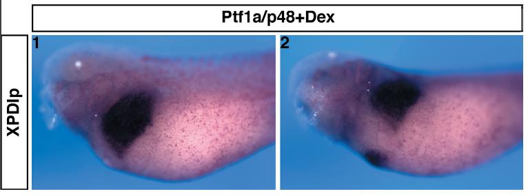 Fig. S1. Ectopic pancreatic gene expression remains confined to the domain of prospective stomach and duodenum upon ubiquitous over-expression of XPtf1a/p48GR.