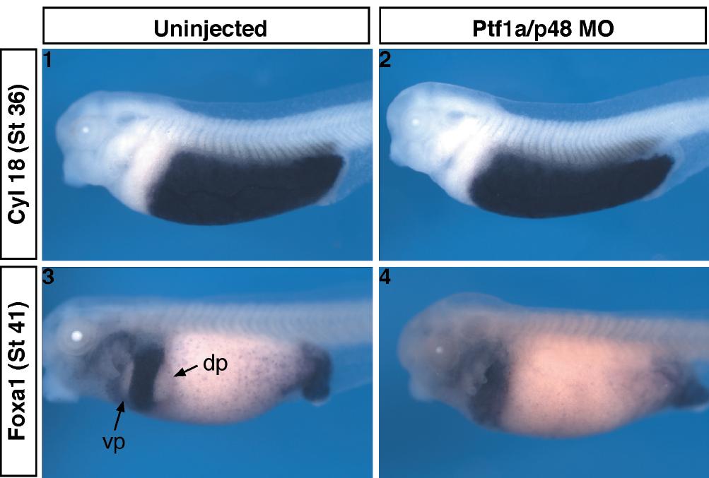 No obvious difference was observed in the expression of Cyl18 in a comparison of Ptf1a/p48 MO injected and uninjected control embryos (1 and 2). Ptf1a/p48 MO injected embryos, that display a loss of the pancreatic buds, reveal no significant change of Foxa1 expression, except for a slight anterior shift into presumptive stomach and duodenum (panel 4, 59%, n= 22).
