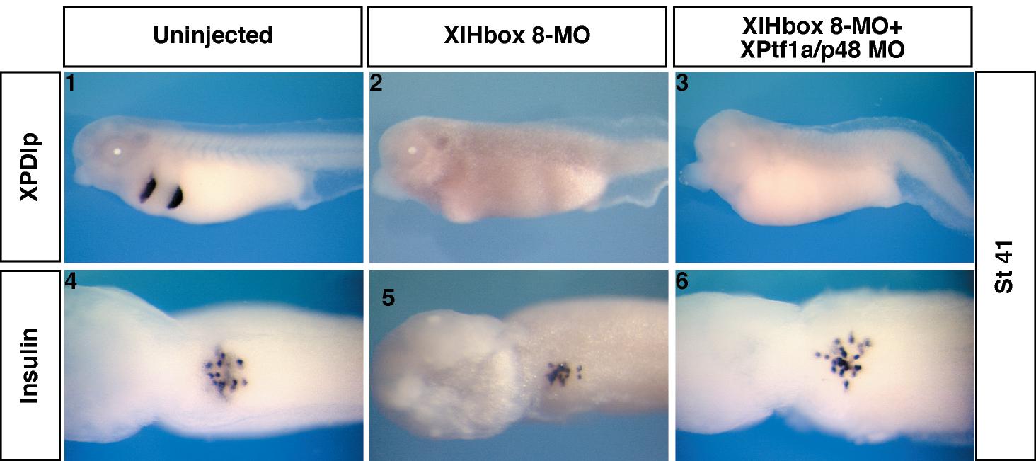 (1-3) Lateral view, (4-6) dorsal view after removal of somites, neural tube and notochord. Injection of XlHbox8-MO results in the inhibition of XPDIp expression (2), while early insulin expression is not affected (5). Co-injection of both XlHbox8 and Ptf1a/p48 MOs results in the same situation, i.e. loss of XPDIp expression (3) and maintenance of early insulin expression (6). Phenotype in panel 2, 100%, n = 25; panel 3, 100%, n = 30; panel 5, 100%, n = 29; panel 6, 100%, n = 30. Morphometric quantification of insulin expression: average pixel number-panel 4, 16822 ± 1438; panel 5, 14065 ± 3774; panel 6, 14396 ± 3701.