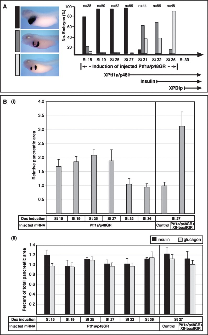 Figure 3. The Ptf1a/p48-mediated increase of ectopic exocrine and late endocrine cells requires uncommitted endoderm. Dexamethasone induction of injected embryos was performed at different time points in between stage 15 and stage 36, as indicated. The effects on pancreas development were evaluated by whole-mount in situ hybridization analysis of XPDIp expression at stage 41 for the exocrine pancreas, and double-staining immunohistochemical analysis of insulin and glucagon expression at stage 48 for the endocrine pancreas. For morphometric quantification, the pixel number of insulin-positive and glucagon-positive cells was measured separately in serial sections using Adobe. (A) The extent of ectopic XPDIp expression at stage 41 is dependent on the stage of induction of injected Ptf1a/p48GR. The bottom right part illustrates the temporal expression profile of endogenous XPtf1a/p48, insulin, and XPDIp. (B) Despite an increase in total pancreatic area, there is no significant difference in the ratio of endocrine to exocrine pancreatic cells in embryos overexpressing Ptf1a/p48 alone or in combination with XlHbox8. (Panel i) Ectopic expression of Ptf1a/p48GR alone or in combination with XlHbox8GR results in a roughly two- and threefold increase in total pancreatic area relative to uninjected control embryos, respectively. (Panel ii) No significant difference is observed for the ratio of endocrine to total pancreatic area in a comparison of different time points for dexamethasone treatment. Sectioned pancreatic tissue was immunostained for insulin and glucagon, nuclei were counterstained with DAPI. Boundaries of the pancreatic area were delineated on the basis of morphology and pixel quantification was performed using Adobe Photoshop. An entire series of sections was analyzed for eight different embryos in each experiment. The average total pixel number of a series of pancreatic sections from control embryos is referred to as 1.