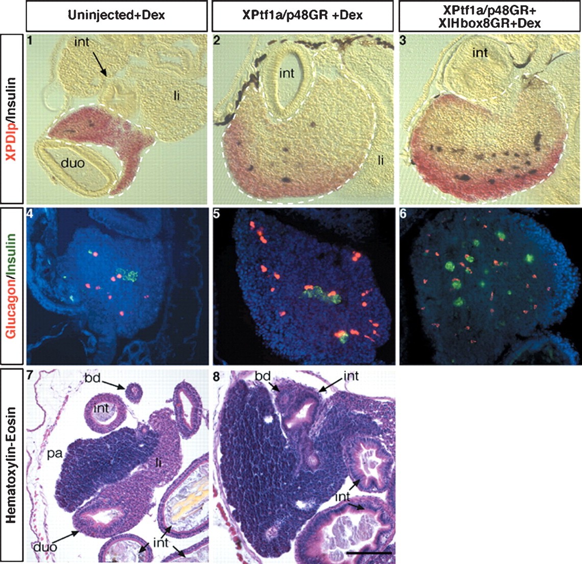 Figure 4. Giant pancreata containing both differentiated endocrine and exocrine cells at late tadpole stage are generated by ectopic expression of XPtf1a/p48GR alone or in combination with XlHbox8GR. (Panels 1â3) Vibratome sections of stage 48 embryos (microinjected as indicated and dexamethasone-treated at stage 27) after double-staining whole-mount in situ hybridization (insulin in blue, XPDIp in red). Due to incomplete probe penetration into the giant pancreas, the inner part remains refractory to the staining procedure; the boundaries of pancreatic tissue (broken line) were identified by microscopic analysis. Phenotype in panel 2, 60%, n = 15; in panel 3, 66%, n = 12. (Panels 4â6) Double-staining, immunohistochemical analysis for insulin (green) and glucagon (red) expression. In panel 5, 70%, n = 10; in panel 6, 62%, n = 8 (morphometric quantification, see Fig. 3). Bar, 200 μm. (Panels 7,8) Histological analysis (hematoxylin and eosin staining) of pancreas and neighboring tissues. In panel 8, 58%, n = 12. (bd) Bile duct; (duo) duodenum; (int) intestine; (li) liver; (pa) pancreas.