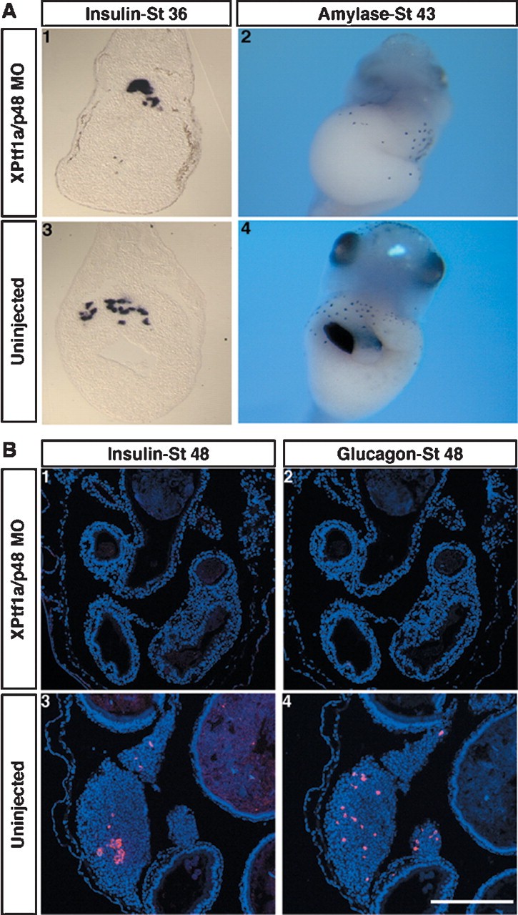 Figure 5. Early insulin expression is independent of XPtf1a/p48, while later pancreatic insulin and glucagon expression depends on XPtf1a/p48. (A) Knockdown of XPtf1a/p48 by antisense MO injection results in a loss of exocrine pancreatic gene expression, while early dorsal insulin expression remains unaffected. (Panels 1,3) Transverse vibratome sections (panel 1, 100%, n = 85; morphometric quantification of insulin expression, average pixel number in panel 1, 12,265 ± 5152; panel 3, 15,537 ± 2108). (Panels 2,4) Ventral view, head toward the top (panel 2, 77%, n = 27). (B) The second phase of endocrine pancreatic differentiation is blocked upon knockdown of XPtf1a/p48 by antisense MO injection. Immunohistochemical analysis of insulin and glucagon expression in uninjected control (panels 3,4) and in XPtf1a/p48 MO-injected embryos (panels 1,2) at stage 48 of development. Phenotype in panels 1 and 2, 60%, n = 15. Bar, 200 μm.