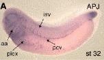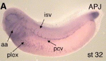 In the Xenopus embryo at the early tailbud stage (stage 32) APJ expression marks developing blood vessels throughout the embryo. The aortic arch region (aa) and the posterior cardinal vein (pcv), ventral vascular plexus (plex) and branching intersegmental vessels (isv) are indicated. The region of expression in the tailbud does not appear to be associated with vascular tissue.