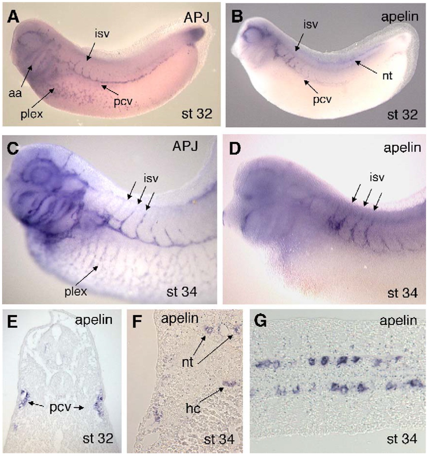 eye. Apelin expression is also detected in the ventral neural tube (nt). (C) At stage 35, APJ transcripts are detected throughout the developing vasculature, including the