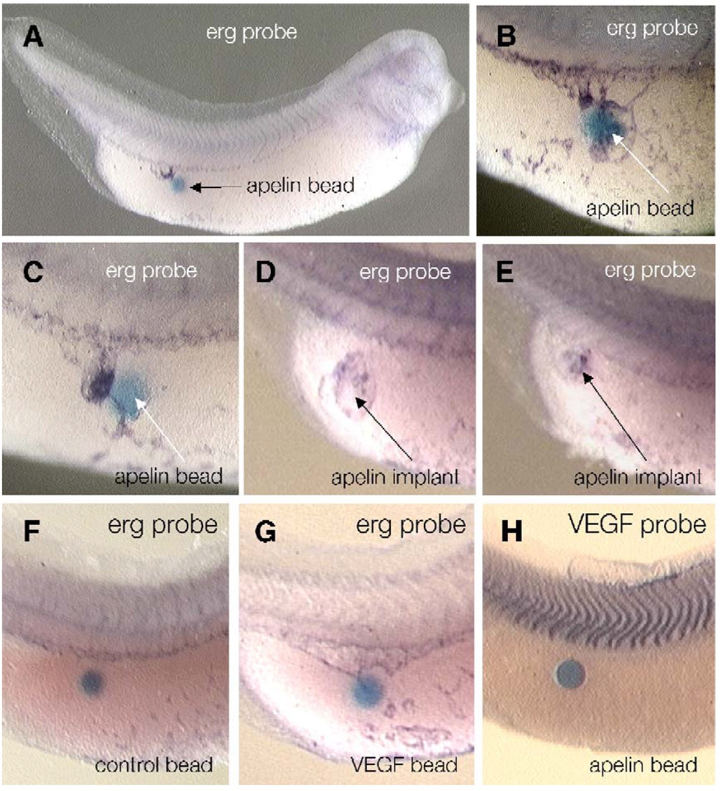 mutated apelin peptide produces no ectopic marker expression. (G) A bead treated with VEGF(165) also produces vascular growth in the Xenopus embryo. (H) In situ
