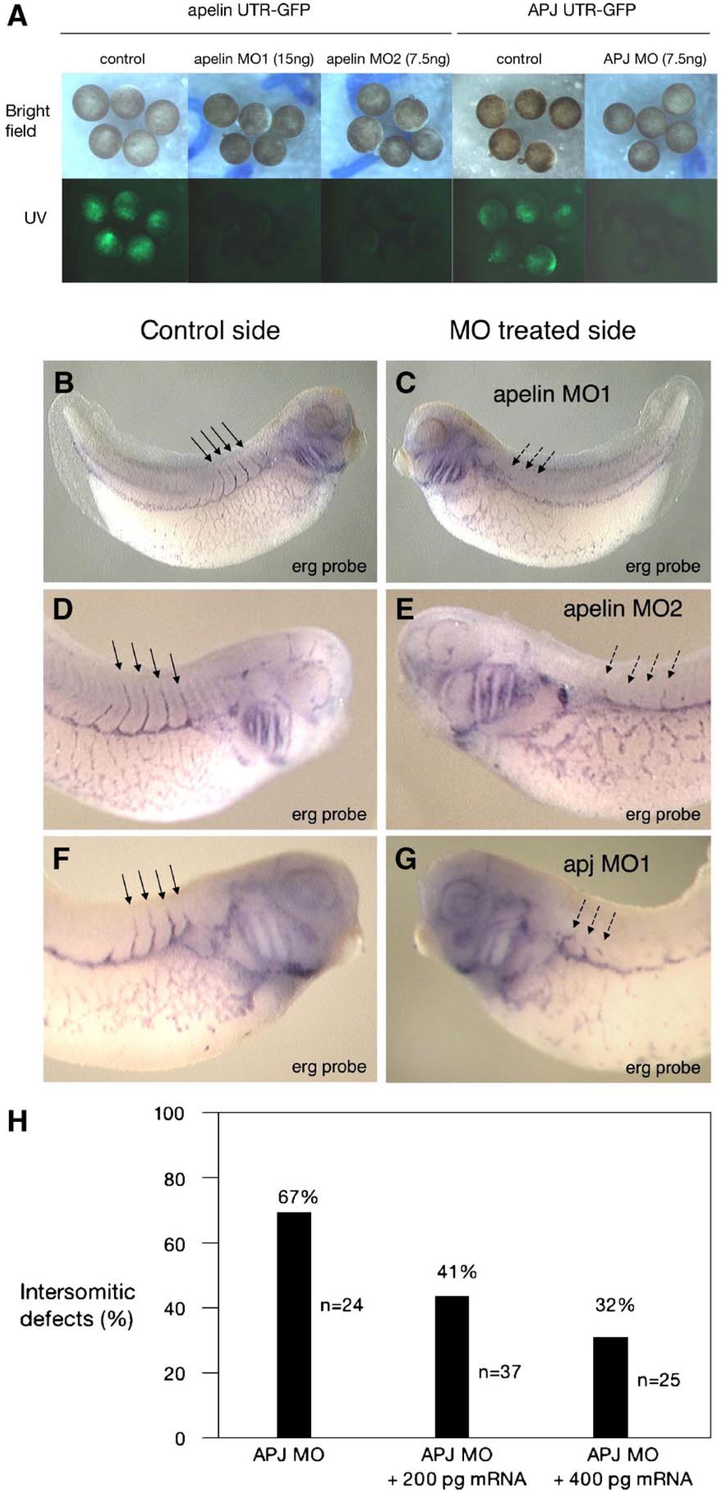 (dashed arrows). (H) Coinjection of APJ mRNA partially rescues intersomitic defects generated using APJ MO1. Rescue with both 200 and 400 pg of APJ mRNA is