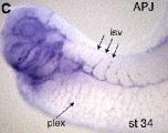 At stage 35, APJ transcripts are detected throughout the developing vasculature, including the assembling vascular plexus in ventrolateral regions of the embryo and distinctly in the intersegmental vessels.