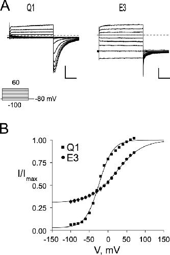 Figure 1. . KCNQ1/KCNE3 channels have a large standing current at negative membrane potentials. (A) Two-electrode voltage clamp recordings from Xenopus oocytes injected with Q1 (left) or Q1/E3 (right). Traces were recorded in KD98 with a 13-s interpulse interval. Dashed line indicates zero current. Inset, “Activation Curve Protocol” of 2-s depolarizations used to elicit currents shown. (B) Voltage–activation curves from Q1 and Q1/E3 channels. Tail currents were measured 3 ms after repolarization, fit to a Boltzmann, and the data normalized such that the upper asymptote was equal to 1. Squares, Q1; circles, Q1/E3. Data were averaged from six oocytes each ± SEM. Scale bars represent 1 μA and 0.5 s.