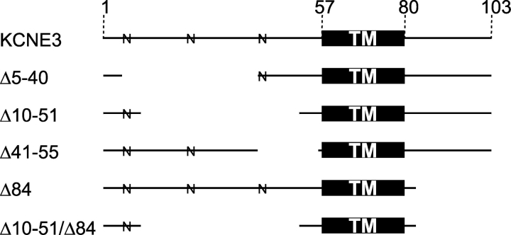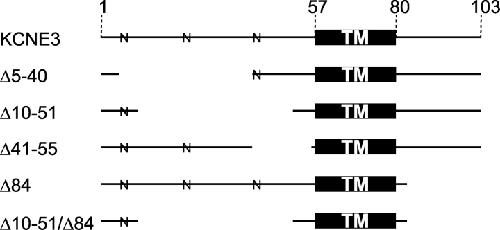 Figure 2. . KCNE3 truncation mutants. Solid lines depict which amino acid residues remain in E3 truncation mutants. Numbers across the top denote amino acid residue number. TM, transmembrane domain; N, putative N-linked glycosylation site.