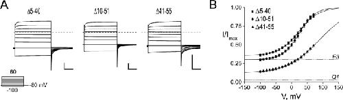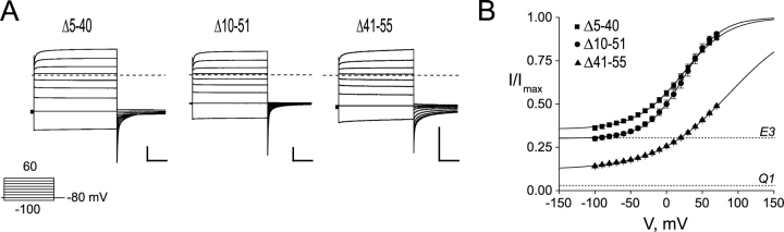 Figure 3. . KCNE3 NH2-terminal truncation mutants produce standing currents at negative potentials when coexpressed with Q1. (A) TEVC recordings from Xenopus oocytes injected with Q1 and either Δ5-40 (left), Δ10-51 (center), or Δ41-55 (right). Traces were recorded in KD98 with a 13-s interpulse interval. Dashed line indicates zero current. Inset, “Activation Curve Protocol” of 2-s depolarizations used to elicit currents shown. (B) Voltage–activation curves from E3 NH2-terminal truncation mutants. Activation curve data were fit to a Boltzmann, and the data renormalized as described in materials and methods. Squares, Δ5-40; circles, Δ10-51; triangles, Δ41-55. Dotted lines indicate the voltage-independent activation of Q1 and Q1–E3 from the lower asymptotes of Q1 the corresponding Boltzmann fits. Data were averaged from four to six oocytes ± SEM. Scale bars represent 1 μA and 0.5 s.