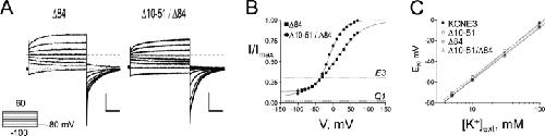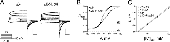 Figure 4. . KCNE3 COOH-terminal and combined NH2- and COOH-terminal truncation mutants also exhibit standing currents at negative potentials when coexpressed with Q1. (A) TEVC recordings from Xenopus oocytes injected with Q1 and either Δ84 (left) or Δ10-51/Δ84 (right). Traces were recorded in KD98 with a 13-s interpulse interval. Dashed line indicates zero current. Scale bars represent 1 μA and 0.5 s. Inset, “Activation Curve Protocol” of 2-s depolarizations used to elicit currents shown. (B) Voltage–activation curves from KCNE3 COOH-terminal and double truncation mutants. Data were fit to a Boltzmann, and normalized as described in materials and methods. Squares, Δ84; circles, Δ10-51/Δ84. Dotted lines indicate the voltage-independent activation of Q1 or Q1–E3 (E3). Data were averaged from four oocytes each ± SEM. (C) External K+ concentration was varied and the reversal potential was measured. log[K+]ext is plotted against observed reversal potential. WT and E3 truncation mutants coexpressed with Q1 produced linear fits within error of 53 mV per decade. Data was averaged from four to six oocytes ± SEM.
