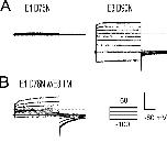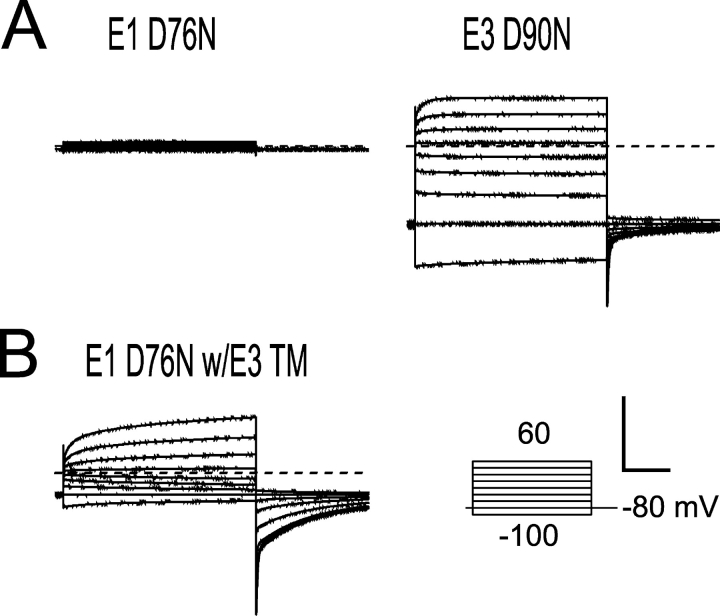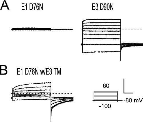 Figure 5. . A long QT mutation in the COOH terminus of KCNE1 is masked by the KCNE3 transmembrane domain. Inset, “Activation Curve Protocol” of 2-s depolarizations used to elicit currents shown. Scale bar represents 1 μA and 0.5 s for all recordings. (A) TEVC recording from Xenopus oocytes injected with Q1 and either E1 D76N (left) or E3 D90N (right). (B) Representative TEVC recordings from oocytes coinjected with Q1 and a chimeric partner protein, E1 D76N with the E3 transmembrane (TM) sequence. All oocytes were injected with equal amounts and ratios of Q1 and E1 or E3 RNA, and were recorded in KD98 using a 13-s interpulse interval. Dashed lines indicate zero current.