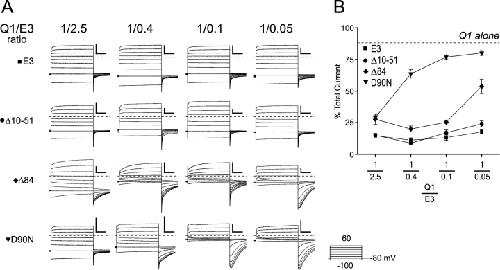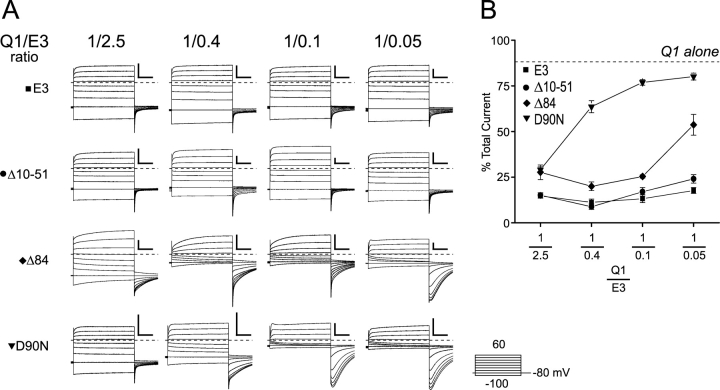 Figure 6. . KCNE3 COOH-terminal mutants demonstrate a functional dependence on cRNA injection ratios. (A) Representative two-electrode voltage clamp recordings taken from oocytes injected with varying amounts of E3, between 2.5x and 0.05x of Q1. Currents were recorded in KD98, using a 13-s interpulse interval. The Q1:E3 ratio is labeled across the top. Top row, E3 (square); second row, Δ10-51 (circle); third row, Δ84 (diamond); bottom row, D90N (triangle). Dashed lines indicate zero current. Scale bars represent 1 μA and 0.5 s. Inset, “Activation Curve Protocol” of 2-s depolarizations used to elicit currents shown. (B) Percent current remaining after inhibition with 10 μM chromanol 293B. Oocytes were held at −80 mV and depolarized for 2 s to + 40 mV with a 28-s interpulse interval. Current levels were allowed to stabilize for ≤5 min before 10 μM chromanol 293B was perfused in. Chromanol inhibition typically reached equilibrium within 5 min of wash in. Dashed line indicates the percentage of current remaining in oocytes expressing Q1 alone. Data was averaged from 3–11 oocytes ± SEM.