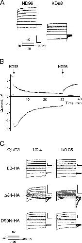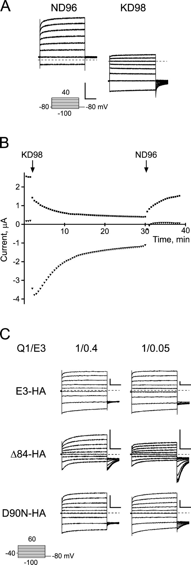 Figure 7. . Functional characterization of KCNQ1/KCNE3–HA complexes. (A) Q1 complexes formed with HA-tagged E3 exhibit potassium-dependent inactivation. TEVC recordings of oocytes expressing Q1 and E3-HA were bathed in ND96 (left) and KD98 (right). Both recordings are shown at the same scale, and use a 13-s interpulse interval. Insets, “Activation Curve Protocol” of 2-s depolarizations used to elicit currents shown. (B) Current versus time plotted for potassium concentration changes for the Q1–E3–HA complex shown in A. Oocytes were held at −80 mV, and depolarized for 2 s to + 40 mV, with a 28-s interpulse interval. Squares denote the current measured at +40 mV, triangles at −80 mV 100 ms before the respective capacitive transients. (C) HA-tagged E3 shows altered dose dependence for the COOH-terminal truncation mutant. TEVC measurements of oocytes injected with 0.4x (left) or 0.05x (right) E3–HA relative to Q1. Currents were recorded with 10 mM Rb+ (RD10), and oocytes were held at −40 mV, with an 11.5-s interpulse interval. Top, E3–HA; middle, Δ84–HA; bottom, D90N–HA. Scale bars represent 1 μA and 0.5 s.