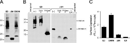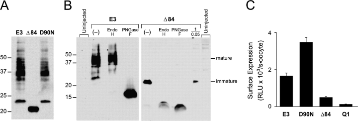 Figure 8. . WT and COOH-terminal mutant HA-tagged KCNE3 peptides are glycosylated and not proteolytically degraded in oocytes. Crude membranes for the immunoblots were prepared 3–5 d after coinjection with Q1 and the indicated E3 construct. (A) Immunoblot of HA-tagged E3 peptides from SDS-solubilized membranes isolated from oocytes injected at a Q1/E3 ratio of 1/0.4. Membranes from three oocytes were loaded in each lane and resolved with a 15% Tris-glycine SDS gel. Molecular weight standards are labeled on the left for both blots. (B) Immunoblots of enzymatically deglycosylated E3 and Δ84 HA-tagged proteins were separated on 16.5% Tris-tricine SDS gels. E3 (four oocytes/lane) and Δ84 (six oocytes/lane) were digested with endoglycosylase Hf (Endo H) or PNGase F. Lane marked (−) represents untreated samples. Loaded in the lane marked 1/0.05 are solubilized membranes from 17 oocytes expressing Q1/Δ84 injected at the lowest Q1/E3 ratio examined. Membranes from uninjected oocytes are denoted and were loaded at the left (4 oocytes) and right (17 oocytes). Mature and immature glycosylation is denoted, as determined by enzymatic deglycosylation. (C) Cell surface expression of HA-tagged E3 proteins was quantitated by single oocyte chemiluminescence. Oocytes were injected with a 1/0.4 Q1/E3 ratio, allowed to incubate for 5 d, and the cell surface–tagged proteins were labeled with an anti-HA antibody followed by a secondary HRP-conjugated antibody. Single oocyte luminescence was quantitated in a luminometer and is reported in relative light units (RLU). Q1 sample is from control oocytes injected with only Q1 RNA. Error bars are standard error measurement from 15–19 oocytes.
