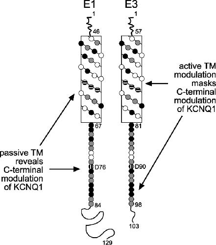 Figure 9. . A bipartite model for modulation of KCNQ1 by KCNE1 and KCNE3. Net diagrams of the transmembrane domains of E1 and E3 are aligned; amino acid residues, denoted as circles, are shaded based on conservation. Black circles, identical amino acids; gray circles, similar amino acids; horizontally striped circles, high-impact amino acids identified by chimeric studies; vertically striped circles, D76 and D90; no fill, nonsimilar amino acids; TM, transmembrane domain.