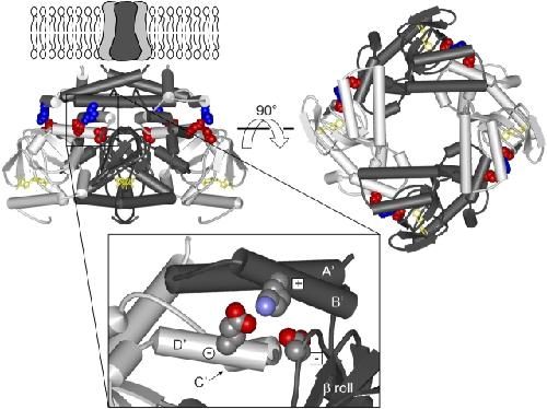 Figure 1. . Structure of HCN2 C-linker and CNBD. Structure of the HCN2 COOH-terminal region (Zagotta et al., 2003), viewed from the side (left) and from the membrane (right). The structure is positioned below the membrane-spanning portion of the channel, as it is thought to be in vivo. The structure contains four subunits, two in dark gray and two in light gray, with the C-linkers making up the top half of the structure and the CNBDs the bottom half. cAMP (yellow) is bound in the CNBD of each subunit. Residues of the putative salt bridges are shown in CPK format: K472 (blue), E502 and D542 (both in red). Enlargement of the region with these salt bridges (inset). Only two subunits are shown here, with the A'–D' helices and β roll labeled, and the residues are now colored according to their elements (carbon, gray; nitrogen, blue; and oxygen, red). Plus sign within a square is K472, minus sign within a square is D542 from the same subunit, and minus sign within a circle is E502 from the neighboring subunit.