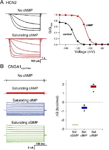 Figure 2. . Behavior of wild-type HCN2 and CNGA1cys-free channels. (A) Behavior of wild-type HCN2 channels. Currents (left) and conductance–voltage relations (right) are shown in the absence (black) and presence of saturating cAMP (red). The currents were recorded in response to voltage pulses from a holding potential of 0 mV to test potentials between −70 and −150 mV, returning to a tail potential of −40 mV, and the conductance–voltage relations were obtained from normalized tail currents. (B) Behavior of CNGA1cys-free channels. Leak-subtracted currents (left) in response to voltage pulses from a holding potential of 0 mV to test potentials from −100 to +100 mV are shown in the absence (black, not leak subtracted) and presence of saturating cAMP (red), cIMP (blue), and cGMP (green). Box plot (right) of the ΔG for the opening transition with bound cGMP, cIMP, and cAMP. Center line is the median of the data, box is the 25th to 75th percentile of the data, and whiskers are the 5th and 95th percentile of the data. Outliers are shown as symbols.