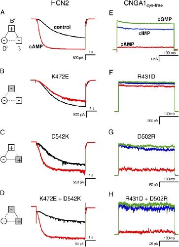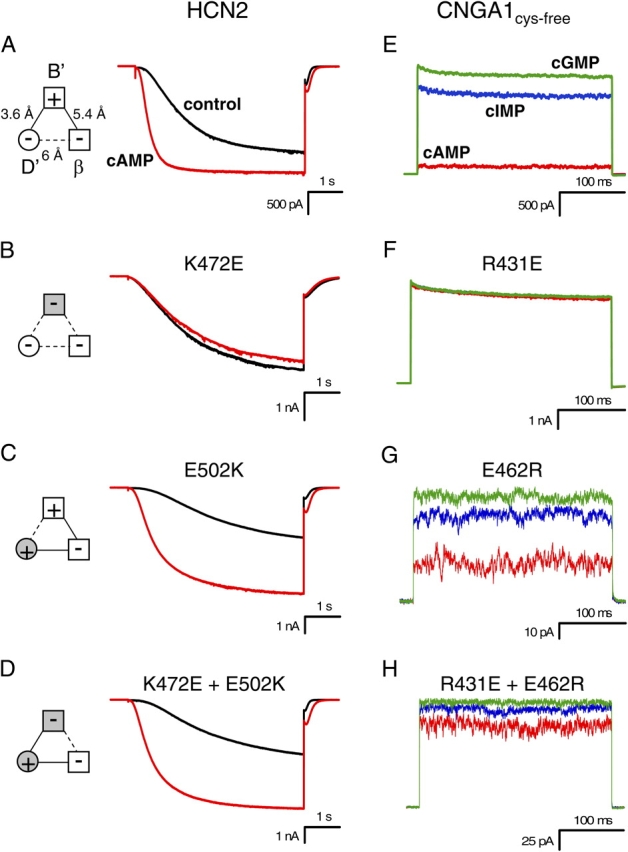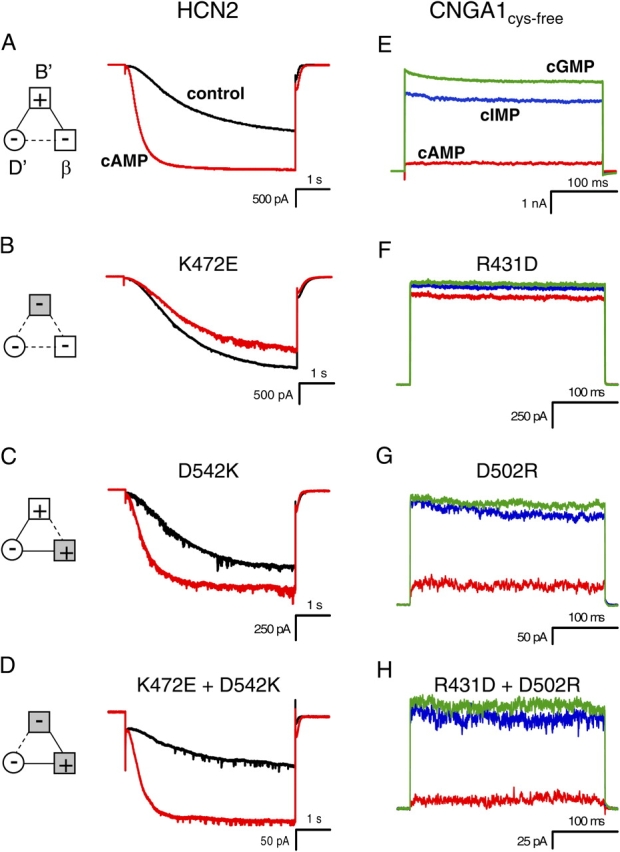 Figure 5. . Mutations of intrasubunit salt bridge. (A–D) Behavior of wild-type HCN2 (A), K472E (B), D542K (C), and K472E + D542K (D) channels. Currents in response to voltage pulses to −130 mV are shown in the absence (black) and presence of saturating cAMP (red). Diagrams to the left show attractive electrostatic interactions by solid lines and repulsive electrostatic interactions by dotted lines with wild-type residues as open symbols and mutant residues as shaded symbols. (E–H) Behavior of CNGA1cys-free (E), R431D (F), D502R (G), and R431D + D502R (H) channels. Current in response to voltage pulses to +100 mV are shown in the presence of saturating cAMP (red), cIMP (blue), and cGMP (green).