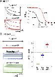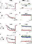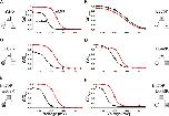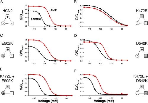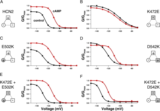Figure 6. . Conductance–voltage relations for HCN2 channels. (A–F) Conductance versus voltage plots for wild-type HCN2 (A), K472E (B), E502K (C), D542K (D), K472E+E502K (E), and K472E+D542K (F). Each plot indicates GV curves, obtained from normalized tail currents at −40 mV, in the absence (black) and presence of saturating cAMP (red). The data are fit with a Boltzmann relation. Diagrams on the left and the right show attractive electrostatic interactions by solid lines and repulsive electrostatic interactions by a dotted line with wild-type residues as open symbols and mutant residues as shaded symbols.