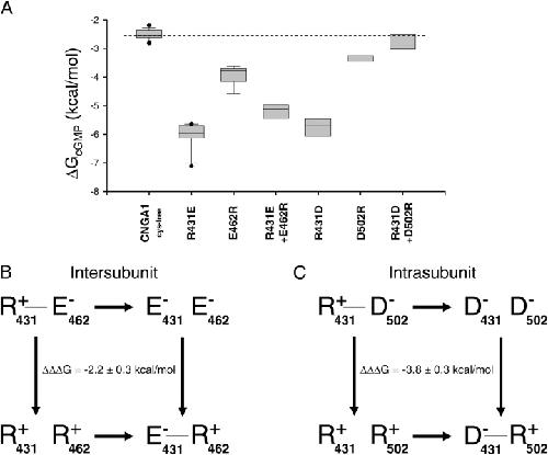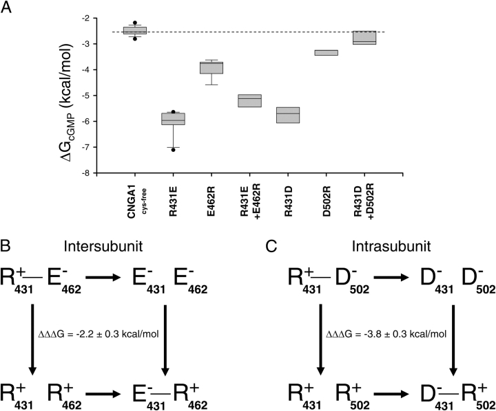Figure 7. . Thermodynamic mutant cycle analysis for CNGA1 channels. (A) Box plot of ΔGcGMP values for CNGA1cys-free and mutant CNGA1 channels. The dashed line indicates the median ΔGcGMP value for CNGA1cys-free. (B and C) Thermodynamic mutant cycles for the intersubunit salt bridge (B) and intrasubunit salt bridge (C). The letters are the amino acid abbreviations for the residues, the number indicates the residue number, and the charge of the residue is also shown. The lines indicate when a salt bridge is possible between residues with opposite charges. ΔΔΔG values were calculated from ΔG values (see materials and methods) and are shown as mean ΔΔΔG ± SEM of ΔΔΔG.