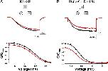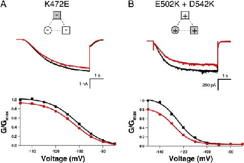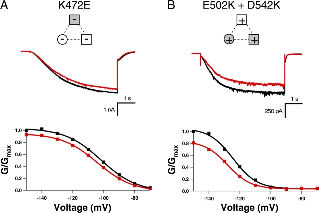 Figure 8. . Double negative-to-positive HCN2 mutant has same phenotype as B' helix site positive-to-negative mutant. Behavior of K472E (A) and E502K+D542K (B) HCN2 channels. Currents in response to voltage pulses to −130 mV, as well as conductance–voltage relations of the normalized conductance from tail currents at −40 mV, are shown in the absence (black) and presence of saturating cAMP (red). Diagrams at the top of each column show attractive electrostatic interactions by solid lines and repulsive electrostatic interactions by dotted lines with wild-type residues as open symbols and mutant residues as shaded symbols. The GV curves are fit with a Boltzmann relation.
