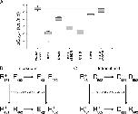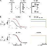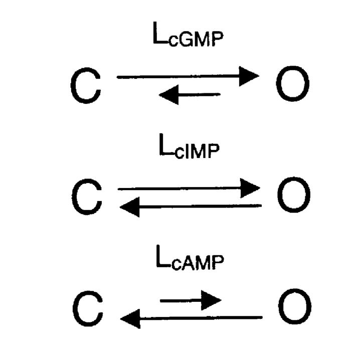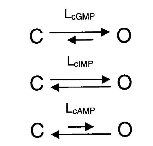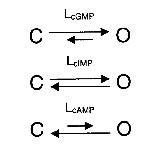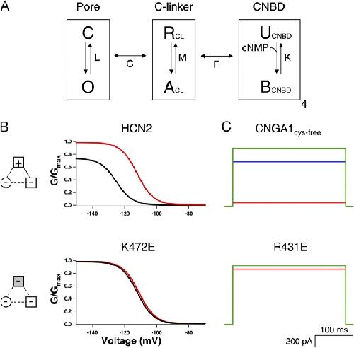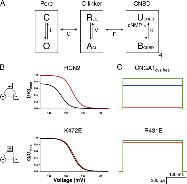 Figure 9. . Model of modular gating scheme for HCN and CNG channels. (A) HCN and CNG gating model with three modules: pore, C-linker, and CNBD. Each module is represented by a boxed equilibrium, indicating that each module can be in one of two configurations. Pore can be closed (C) or open (O), C-linker can be resting (R) or activated (A), and CNBD can be unbound (U) or bound (B) with ligand. Equilibrium constants are shown for each module: L for pore, M for C-linker, and K for CNBD. The pore and the C-linker influence each other through allosteric factor C, and the C-linker and CNBD through allosteric factor F. (B) Simulated conductance–voltage (GV) relations for wild-type (top) and K472E (bottom) HCN2 channels in the absence (black) and presence of saturating cAMP (red). A voltage-dependent module that was coupled to the pore was added for these calculations. The values of the parameters used are shown in the materials and methods. (C) Simulated current traces in response to voltages for CNGA1cys-free (top) and R431E (bottom) channels in the presence of saturating cAMP (red), cIMP (blue), and cGMP (green). For the R431E simulations, the current values for cIMP are so similar to cGMP that the two traces overlay. Diagrams to the left show attractive electrostatic interactions by solid lines and repulsive electrostatic interactions by dotted lines with wild-type residues as open symbols and mutant residues as shaded symbols.
