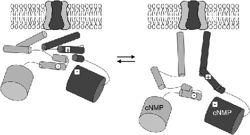 Figure 10. . Model for COOH-terminal region in the resting and activating configurations. Cartoons of HCN2 COOH-terminal region from the side view, both in the resting configuration (left) and the active configuration (right). COOH-terminal regions of two subunits (dark and light gray) are shown below the membrane-spanning portion of the channel. α helices are shown with narrow cylinders, and the β rolls of the CNBDs are shown with wide cylinders. Salt bridge residues are shown: the positive B' helix residue (plus sign within a square) and the two negative residues on the D' helix and the β roll (minus signs within a circle or square, respectively).