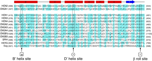 Figure 3. . Sequence alignment of COOH-terminal regions from HCN, CNG, and related channels. Sequence alignment of the COOH-terminal region includes all members of the CNG channel family (bovine CNGA1, rat CNGA2, bovine CNGA3, rat CNGA4, bovine CNGB1, murine CNGB3) and HCN channel family (murine HCN2, mouse HCN1, rat HCN3, rat HCN4), as well as SPIH (the sea urchin sperm homologue of HCN), and the human ether-a-go-go related gene (HERG) and Drosophila Eag K+ channels. Above the sequence alignment, the tertiary structure elements are shown: α-helices (red rectangles), β-sheets (blue arrow), and uncoiled regions (line). Residues highlighted in blue are similar. Putative salt bridge residues studied are boxed and labeled.